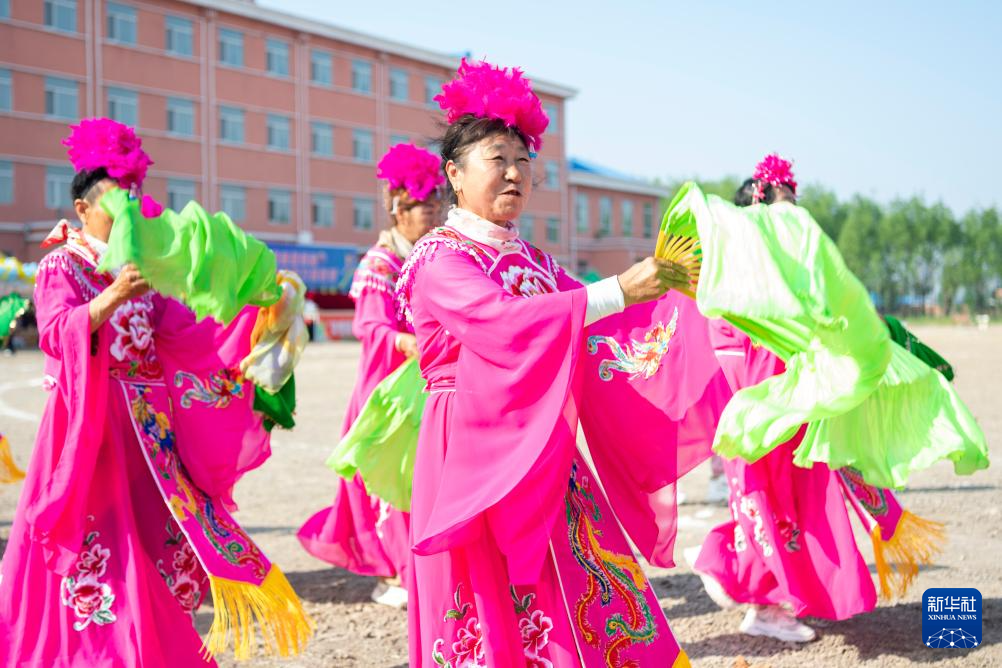 5月29日,当地村民在运动会现场扭秧歌。
