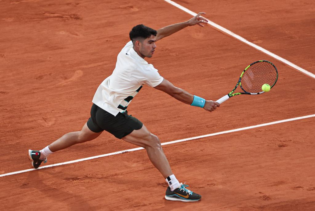 5月30日,阿尔卡拉斯在比赛中回球。新华社记者 李京 摄