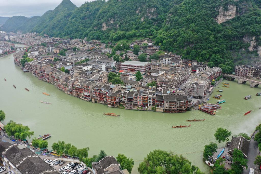 龙舟从镇远古城内驶过(无人机照片)。新华社发(袁福洪 摄)