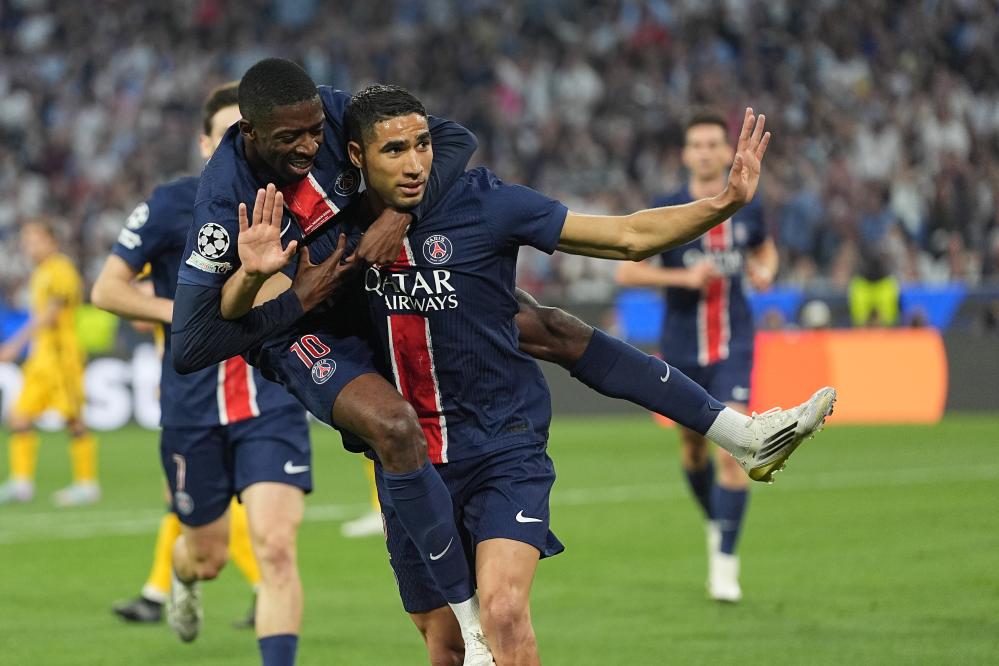 5月31日,巴黎圣日耳曼队阿什拉夫(前右)在比赛中庆祝进球。新华社记者 彭子洋 摄