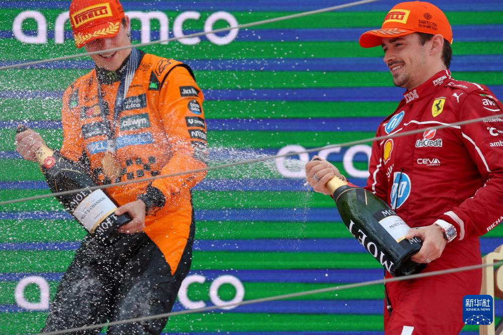 6月1日,冠军迈凯伦车队澳大利亚车手皮亚斯特里(左)与季军法拉利车队摩纳哥车手勒克莱尔在颁奖仪式上喷洒香槟庆祝。