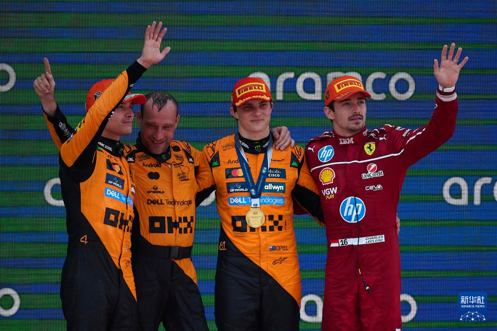 6月1日,冠军迈凯伦车队澳大利亚车手皮亚斯特里(右二)、亚军迈凯伦车队英国车手诺里斯(左一)和季军法拉利车队摩纳哥车手勒克莱尔(右一)在颁奖仪式上。
