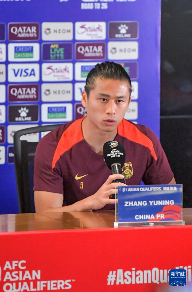 6月4日,中国队球员张玉宁在新闻发布会上。