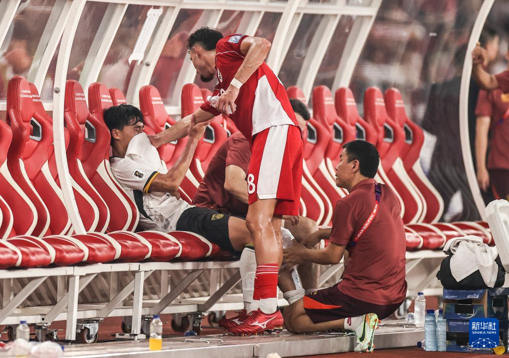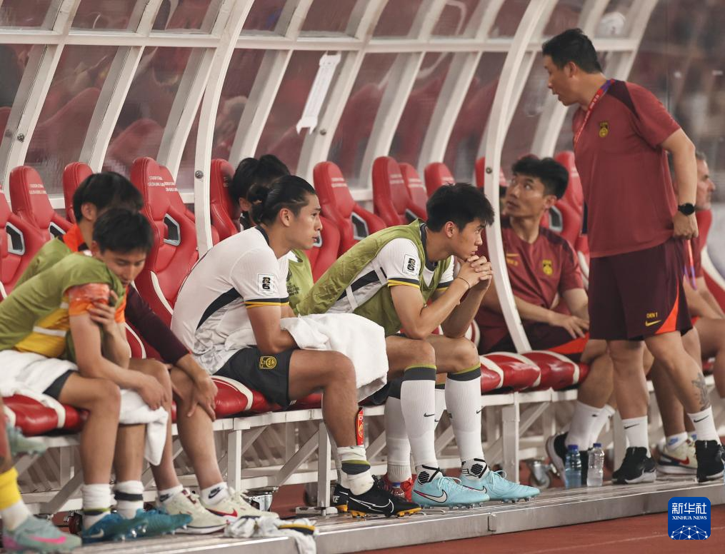 6月5日,中国队球员张玉宁(左三)在比赛中被换下后。