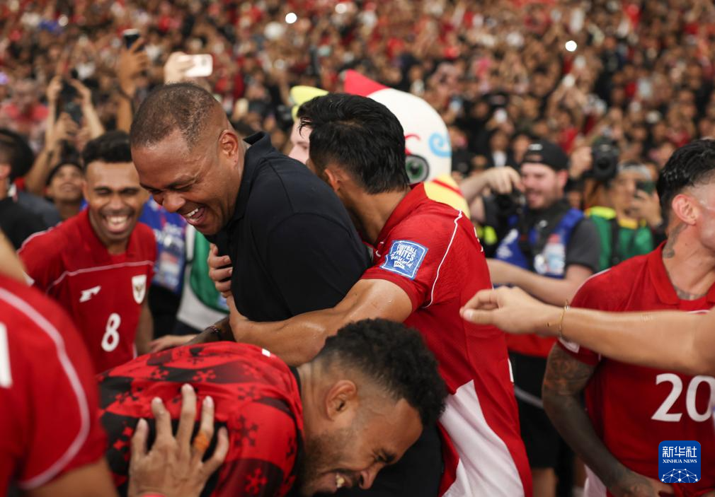 6月5日,印度尼西亚队主教练克鲁伊维特(中)在赛后庆祝。