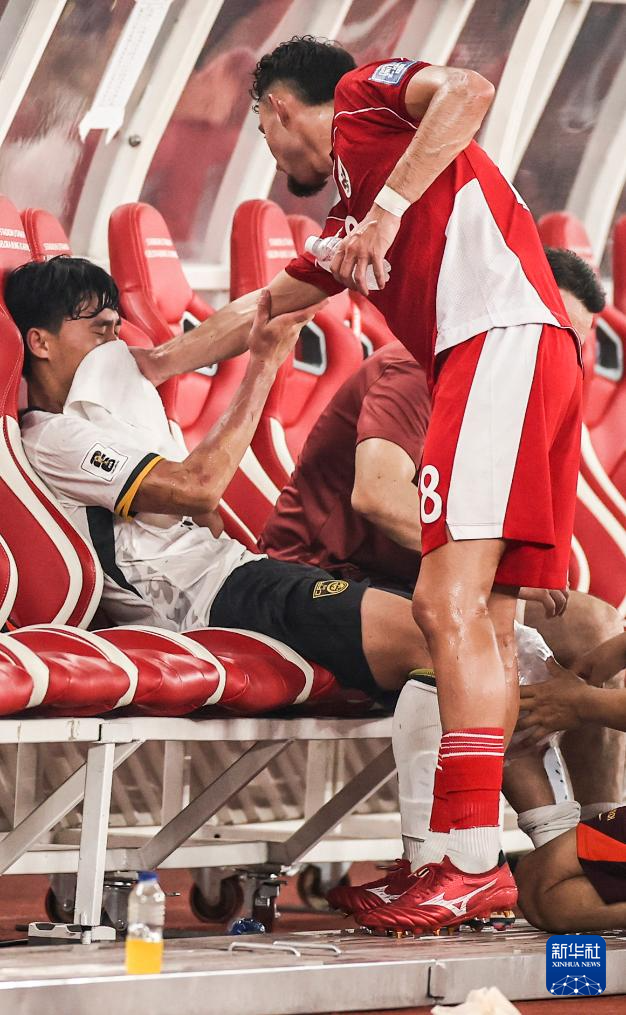 6月5日,中国队球员朱辰杰(左二)在比赛中被队医搀扶下场。