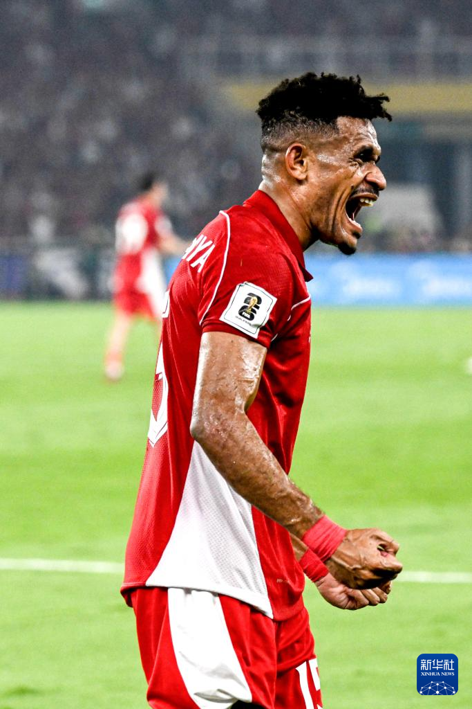 6月5日,印度尼西亚队球员坎布阿亚在比赛中庆祝为球队赢得点球。
