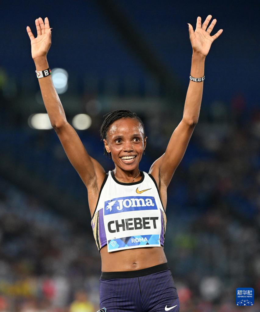6月6日,肯尼亚选手切贝特在女子5000米比赛后庆祝。她以14分03秒69的成绩获得冠军。