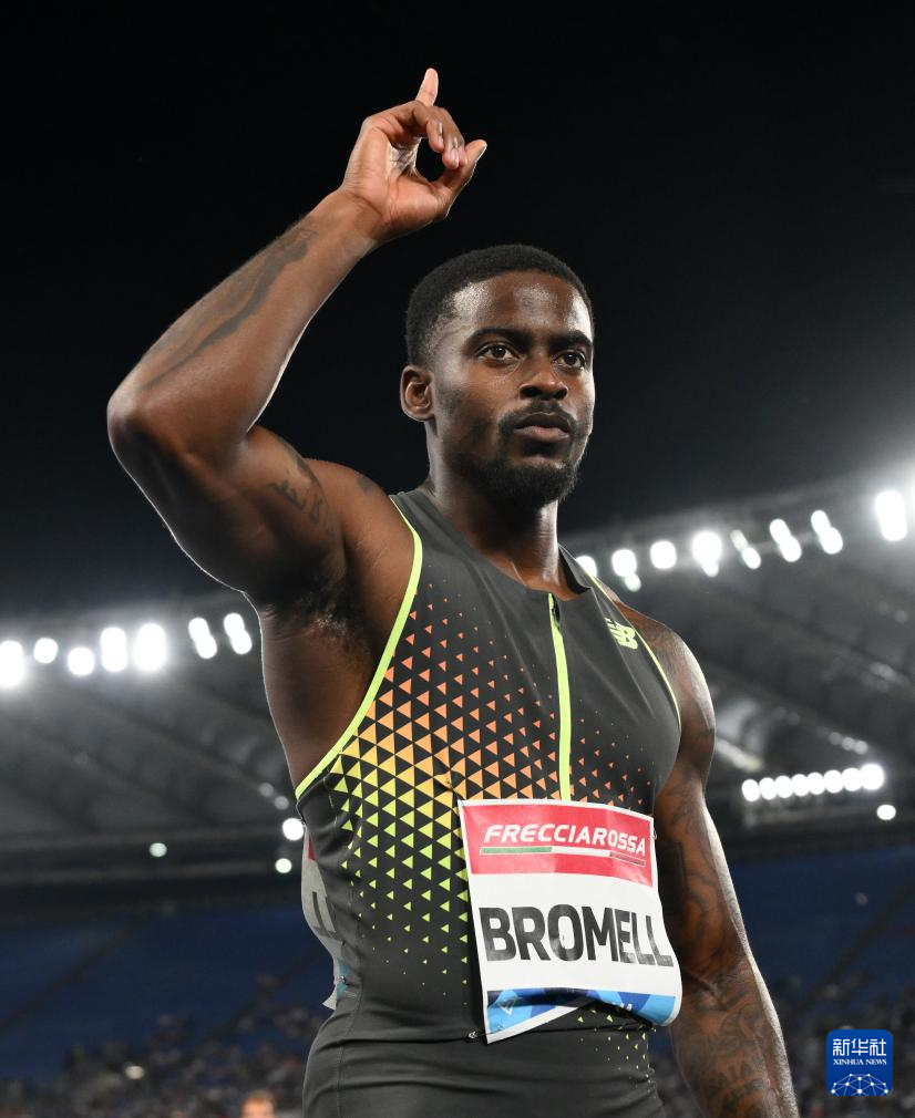 6月6日,美国选手布罗梅尔在男子100米比赛后庆祝夺冠。他以9秒84的成绩获得冠军。