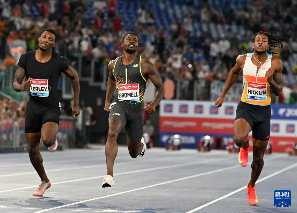 6月6日,美国选手布罗梅尔(中)在男子100米比赛中。他以9秒84的成绩获得冠军。