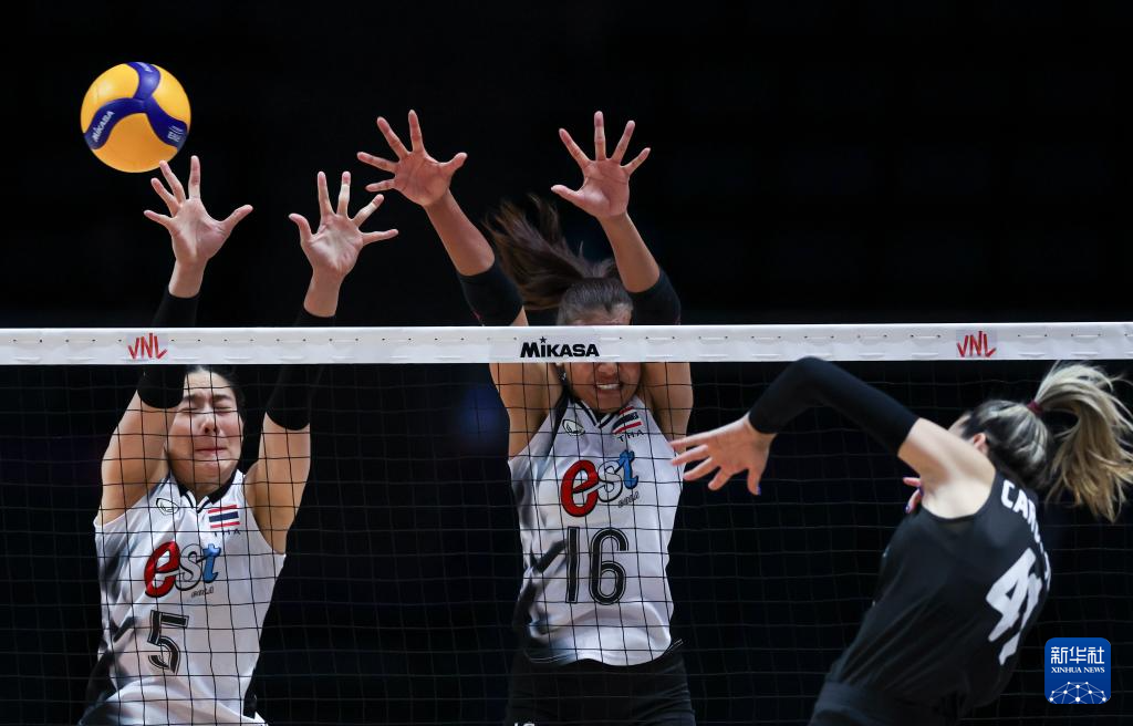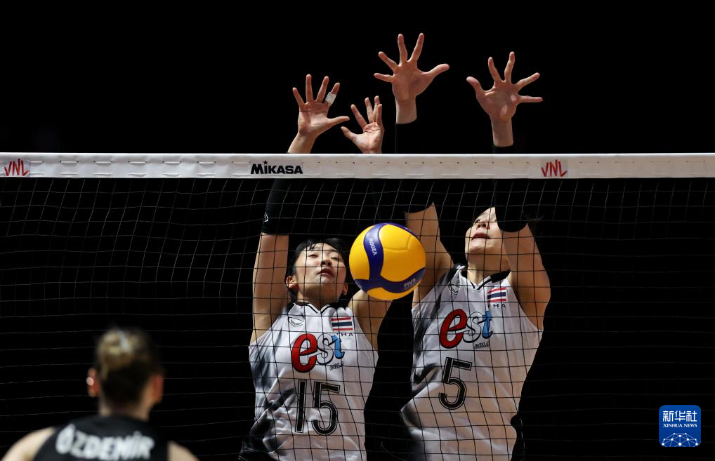 6月6日,泰国队球员他道·努章(左)、宾披猜耶·戈堪(中)在比赛中拦网。