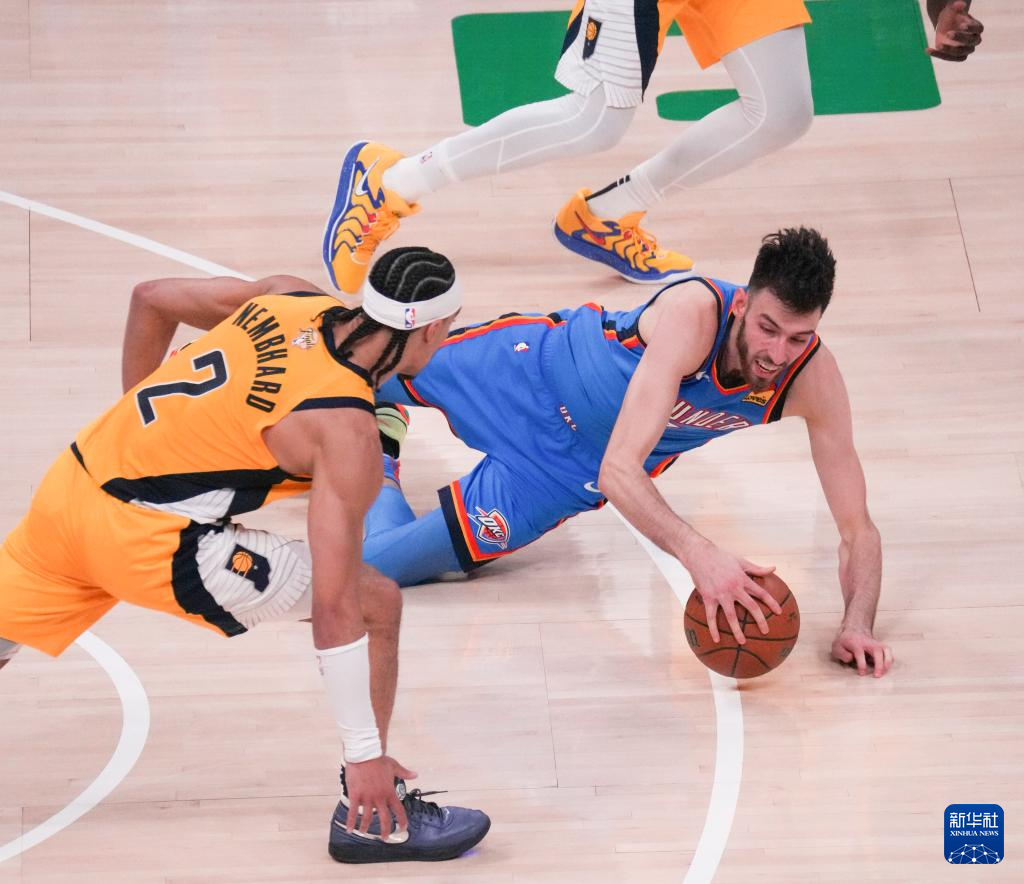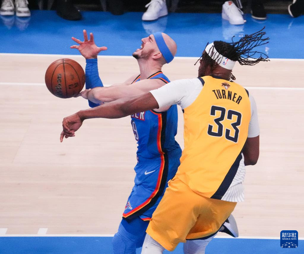 6月8日,雷霆队球员卡鲁索(左)与步行者队球员特纳在比赛中拼抢。