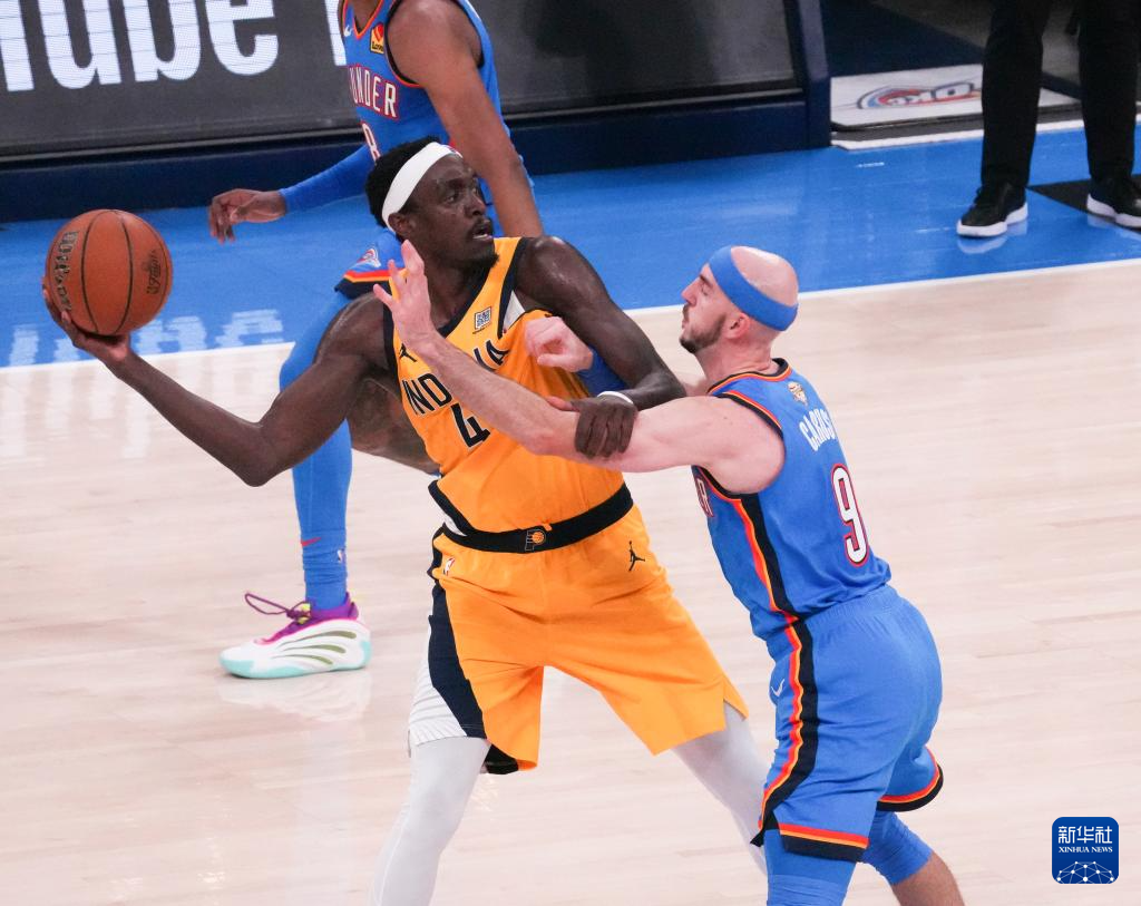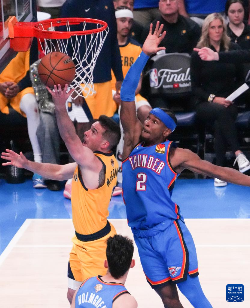 6月8日,雷霆队球员亚历山大(右)在比赛中防守步行者队球员麦康奈尔。
