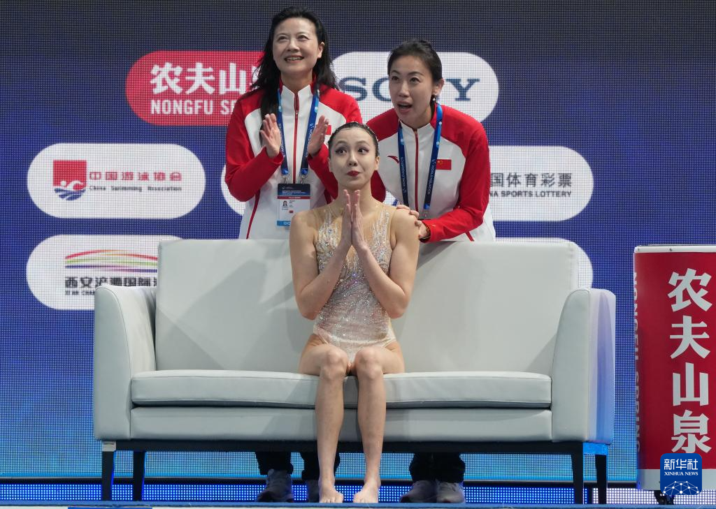 6月13日,中国选手徐汇妍和教练在比赛后向观众致意。最终,她以258.7933分的成绩夺得冠军。