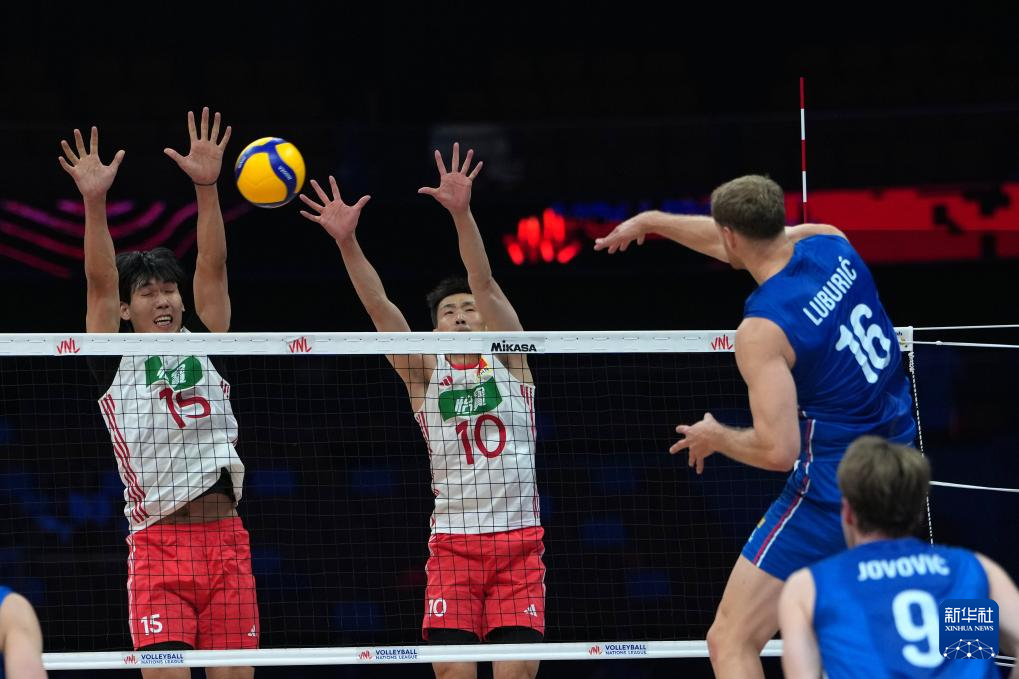 6月12日,中国队球员彭世坤(左)和队友季道帅(中)在比赛中拦截塞尔维亚队球员德拉然·卢布里奇的扣杀。