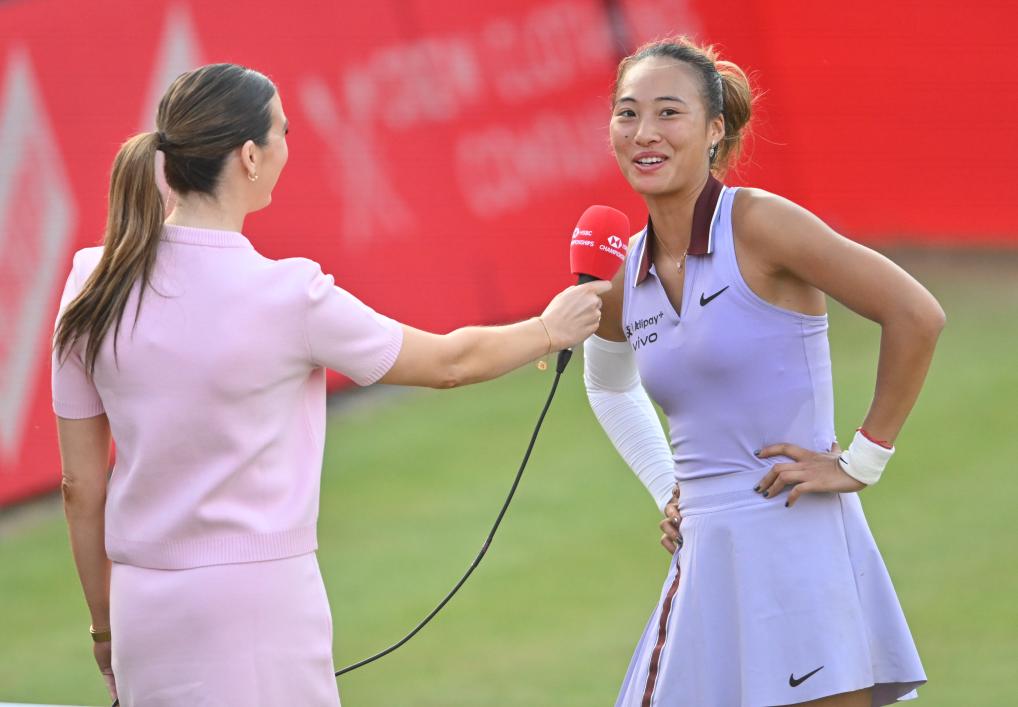 6月12日,郑钦文(右)在比赛后接受采访。新华社发(刘颖 摄)