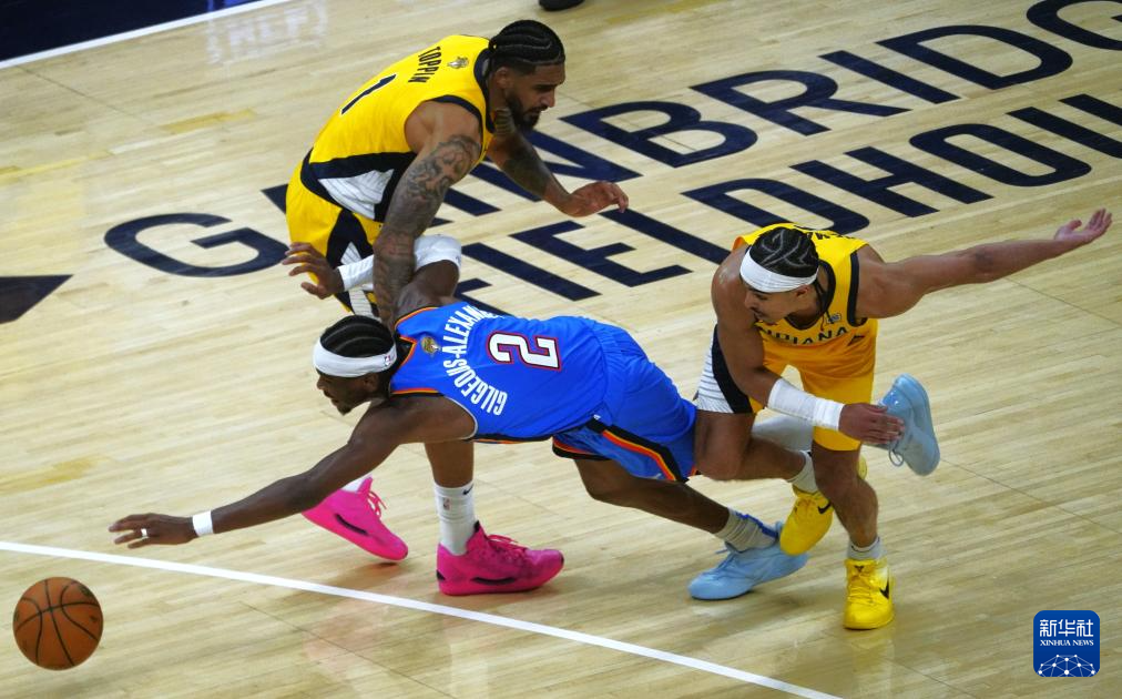 6月13日,雷霆队球员谢伊·吉尔杰斯-亚历山大(下右三)与步行者队球员安德鲁·内姆布哈德(下右四)、西亚卡姆(下右二)在比赛结束前拼抢。