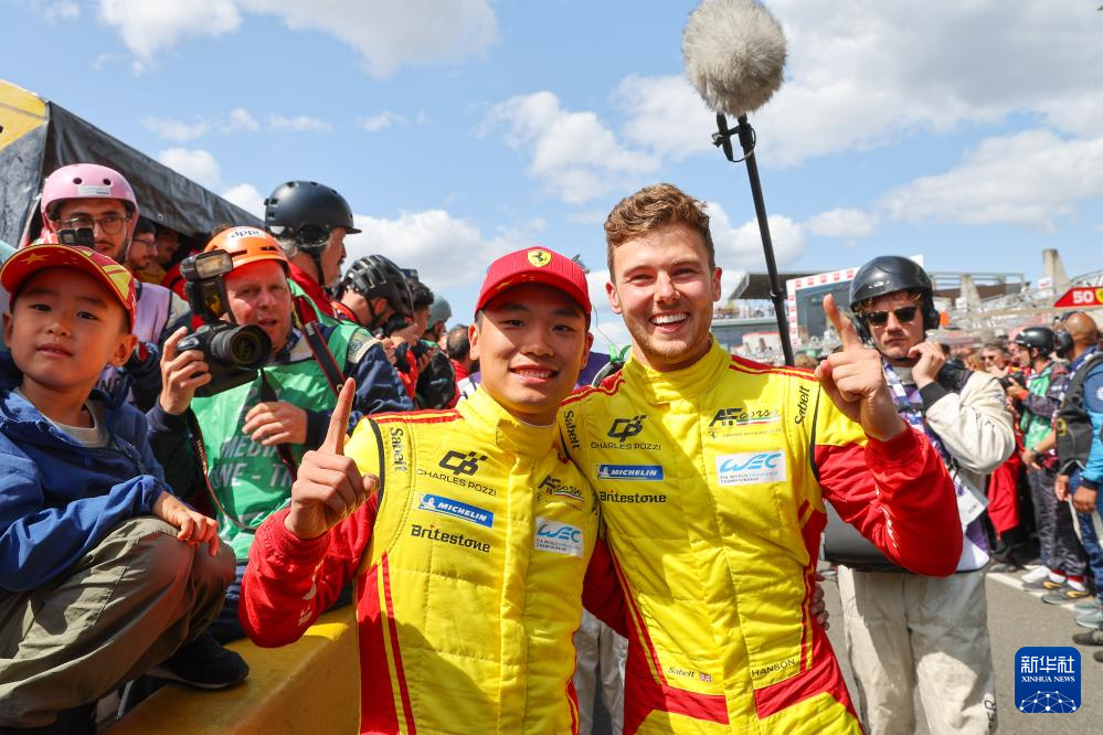 6月15日,法拉利AF Corse 83号车组中国车手叶一飞(前左)和队友英国车手汉森庆祝胜利。