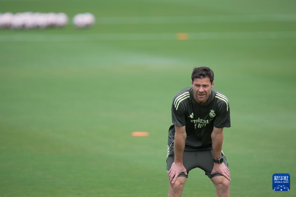 6月17日,皇家马德里队主教练阿隆索在场边观看球员训练。