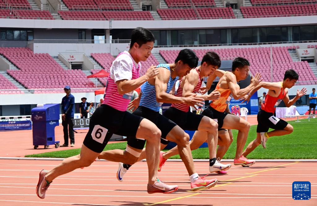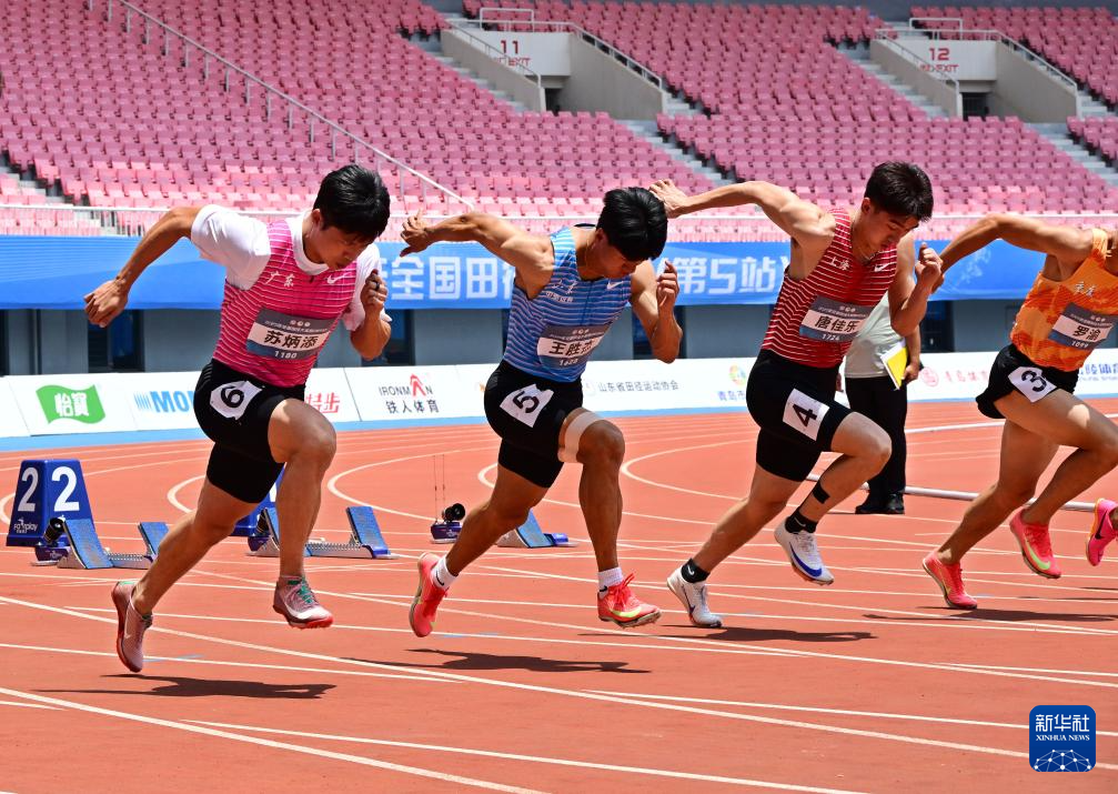 6月18日,广东队选手苏炳添在男子100米预赛前热身。新华社记者 李紫恒 摄