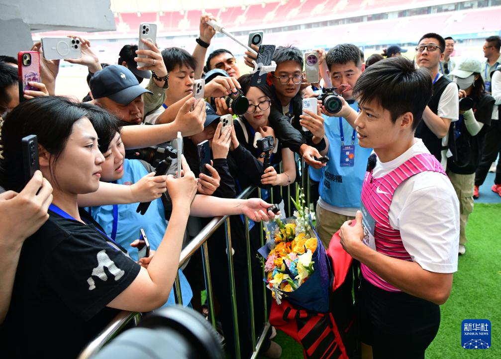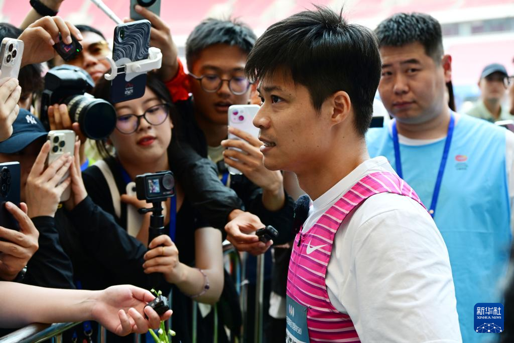6月18日,广东队选手苏炳添在男子100米预赛后接受采访。新华社记者 李紫恒 摄