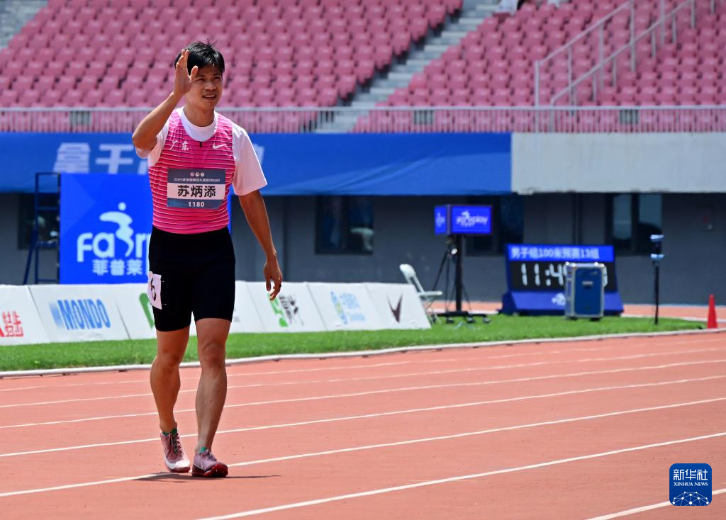 6月18日,广东队选手苏炳添在男子100米预赛前向观众致意。新华社记者 李紫恒 摄