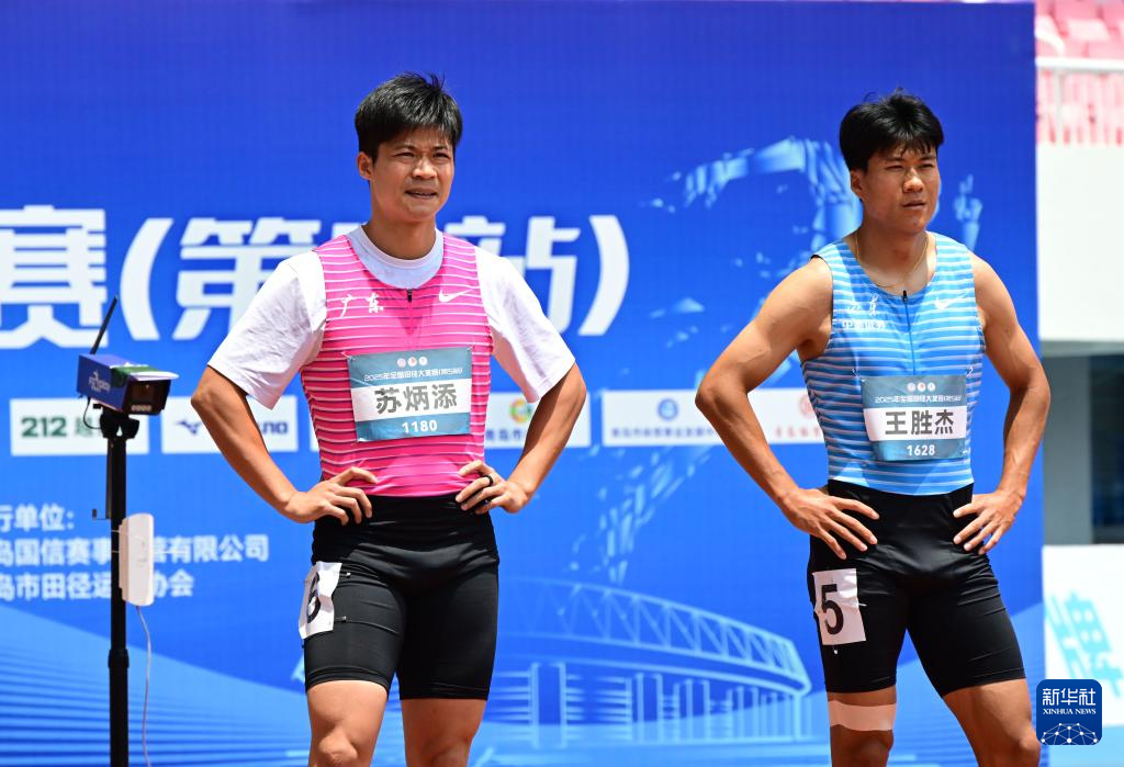 6月18日,广东队选手苏炳添(左)与山东中泰证券队选手王胜杰在男子100米预赛前。新华社记者 李紫恒 摄