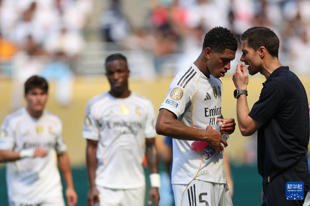 6月18日,皇家马德里队主教练阿隆索(右)在比赛中指导球员贝林厄姆。新华社记者 李明 摄