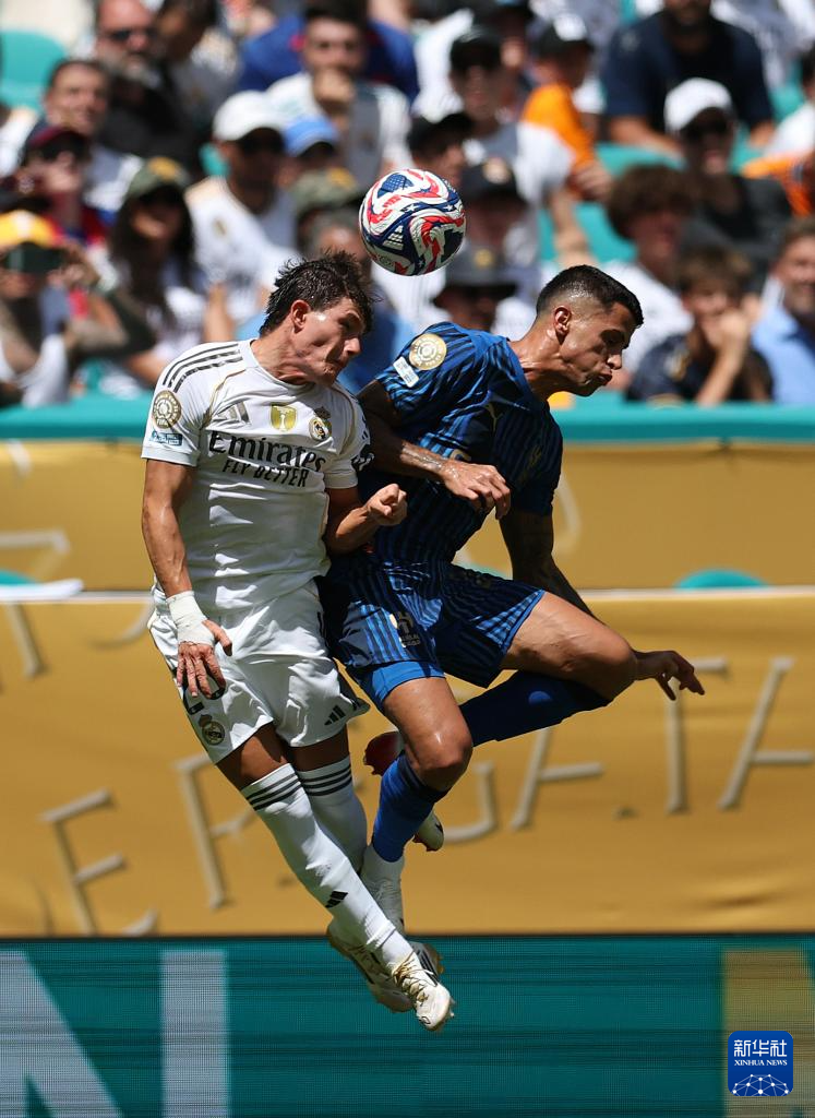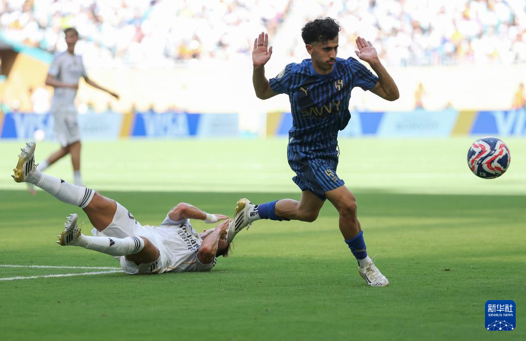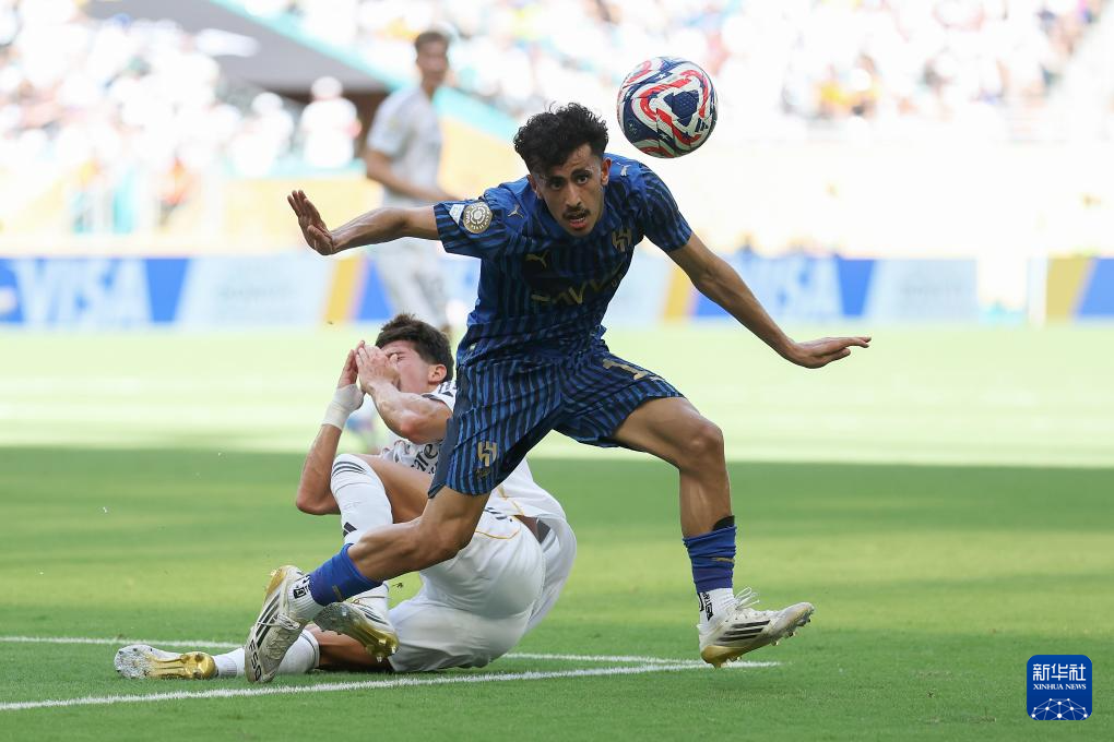 6月18日,皇家马德里队球员弗兰·加西亚(左)与利雅得新月队球员坎塞洛在比赛中争顶。新华社记者 李明 摄