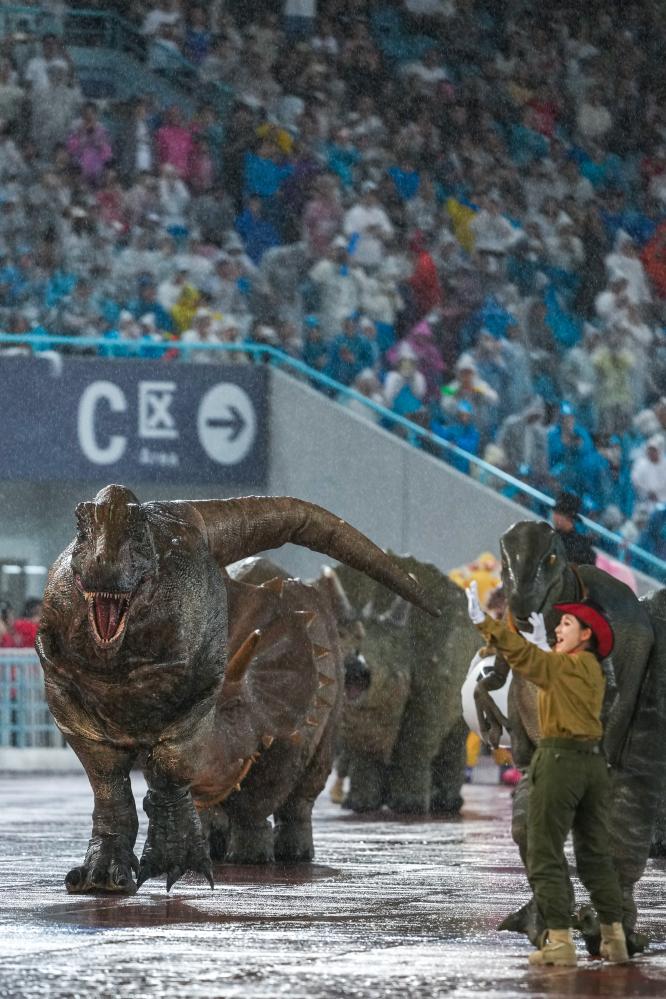 这是6月21日拍摄的比赛中场休息时的恐龙主题表演。新华社记者 李博 摄