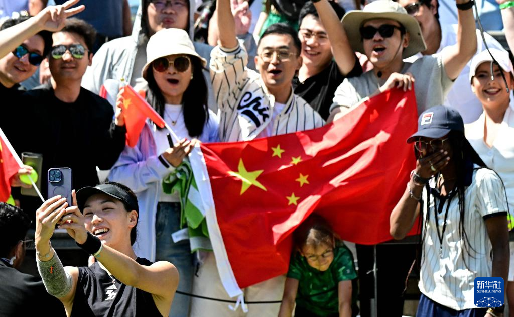 6月20日,王欣瑜(前)赛后与球迷合影庆祝。