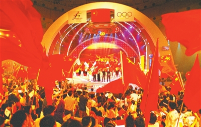 2001年7月13日,人们在央视演播大厅庆祝北京申奥成功。王文波 摄