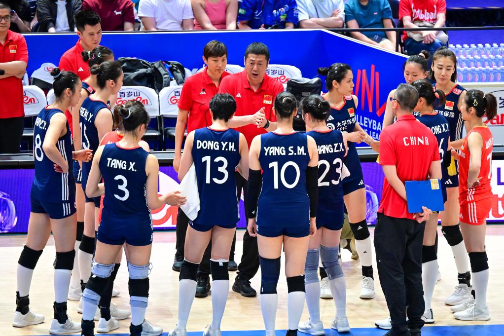 6月22日,中国队主教练赵勇(中)在比赛暂停时指导球员。新华社记者 朱炜 摄