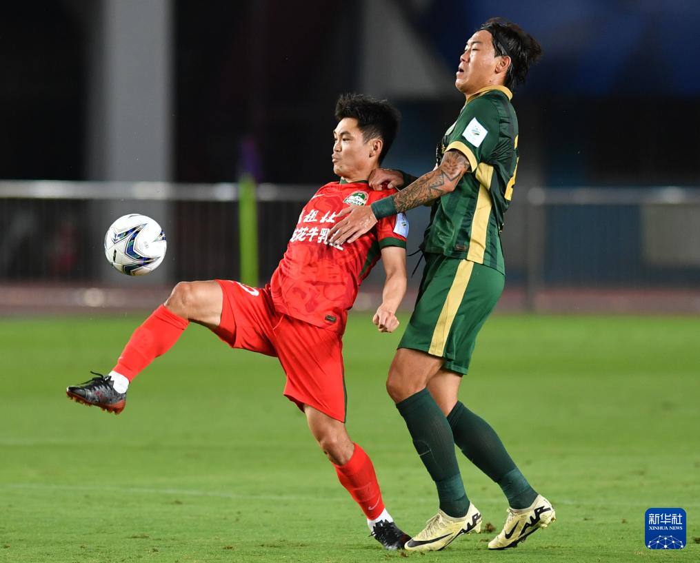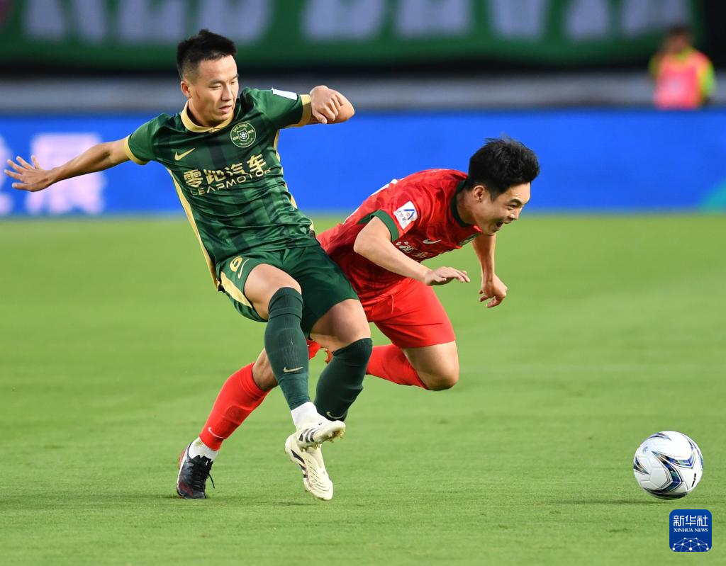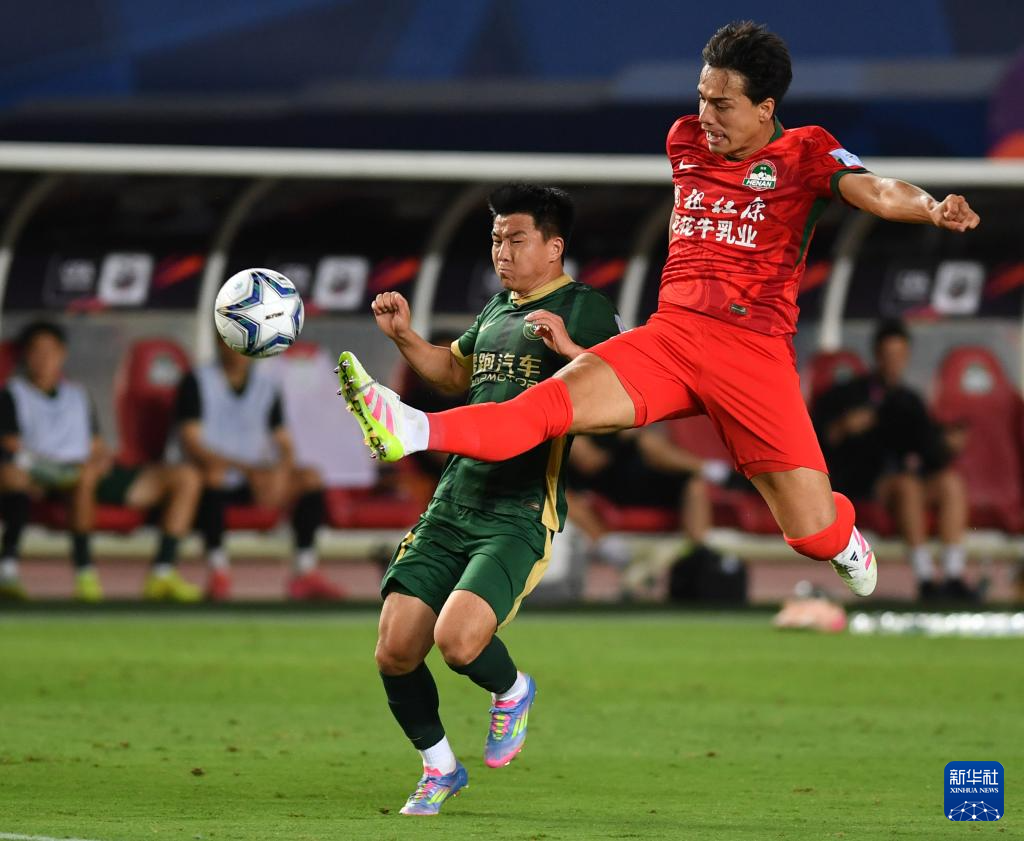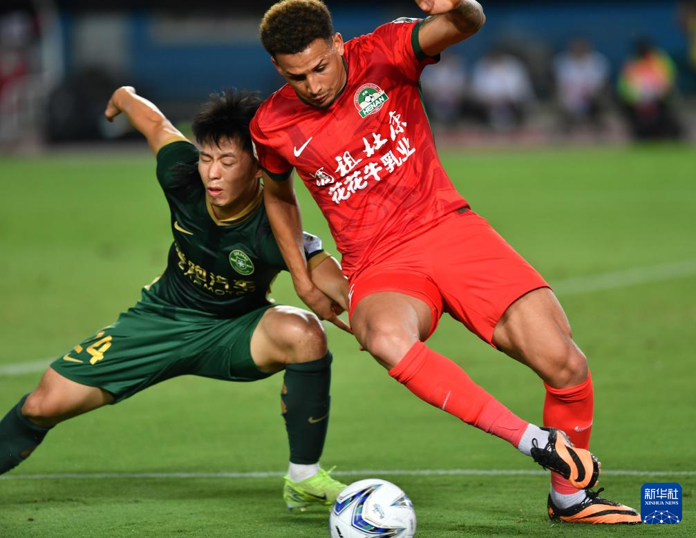 6月22日,河南俱乐部酒祖杜康队球员费利佩·卡多索(右)与浙江俱乐部绿城队球员汪士钦在比赛中拼抢。新华社记者 李嘉南 摄