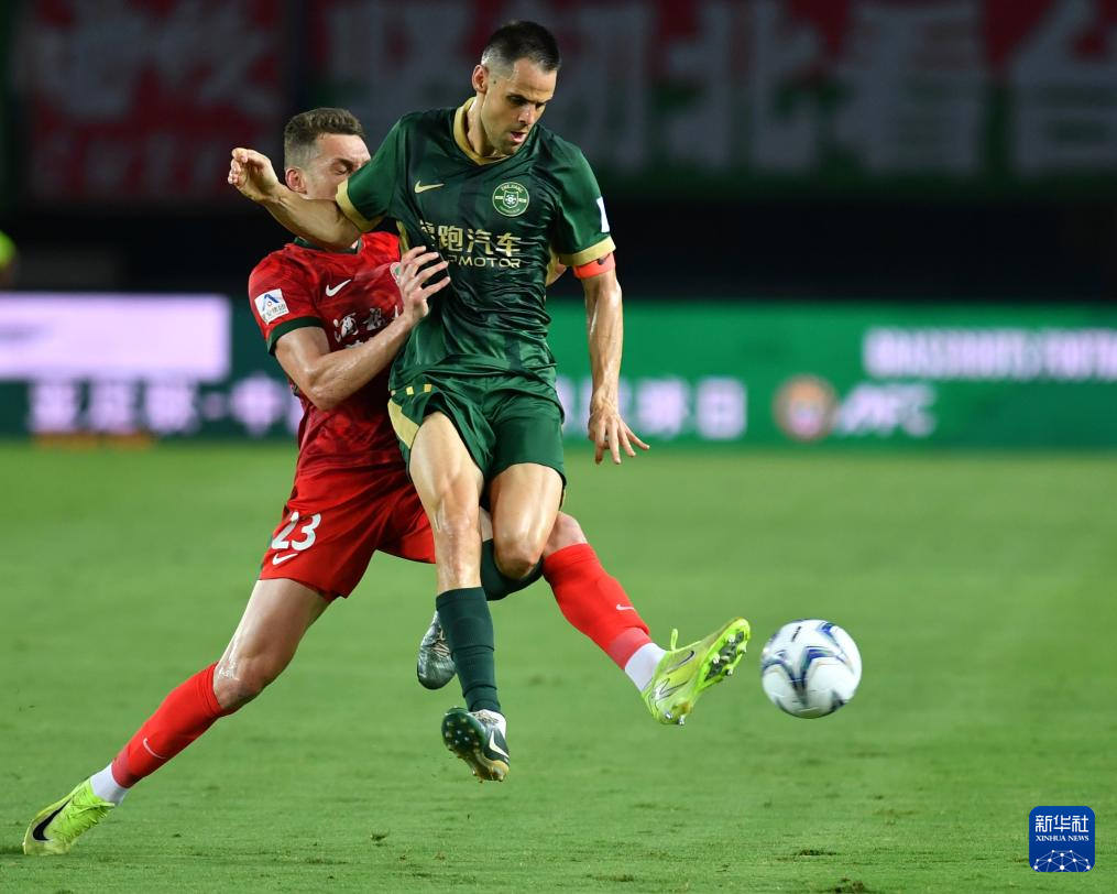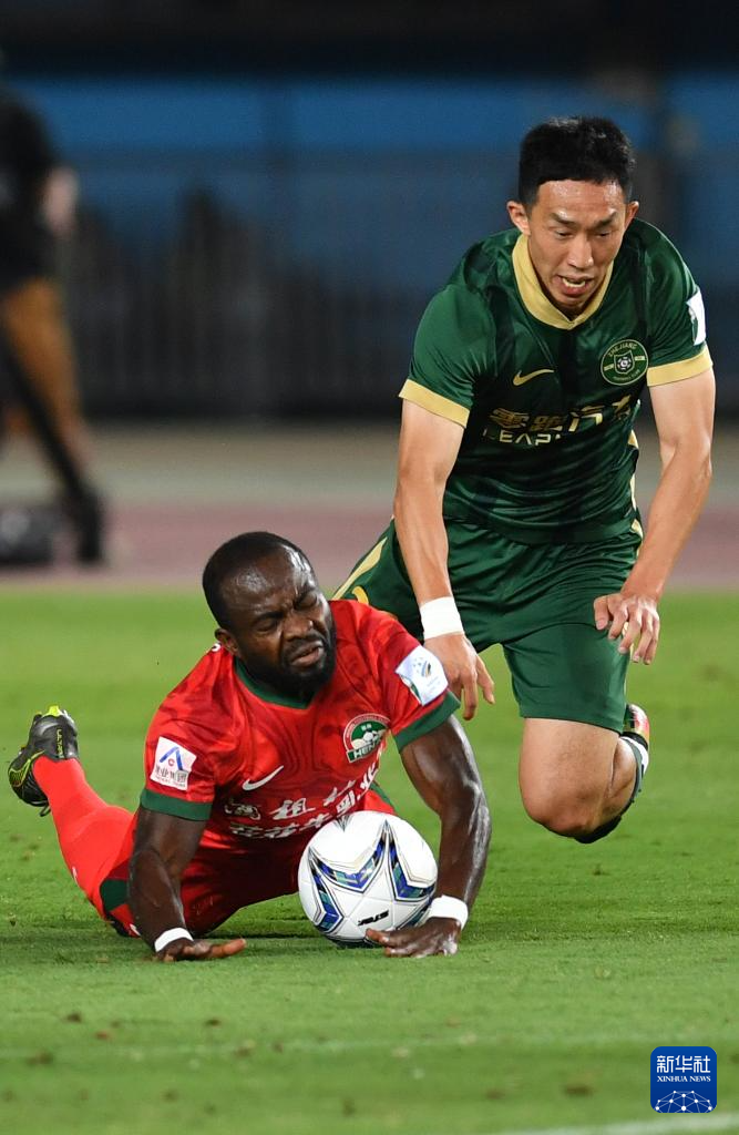 6月22日,浙江俱乐部绿城队球员弗兰克(前)与河南俱乐部酒祖杜康队球员卢卡斯·马亚在比赛中拼抢。新华社记者 李嘉南 摄