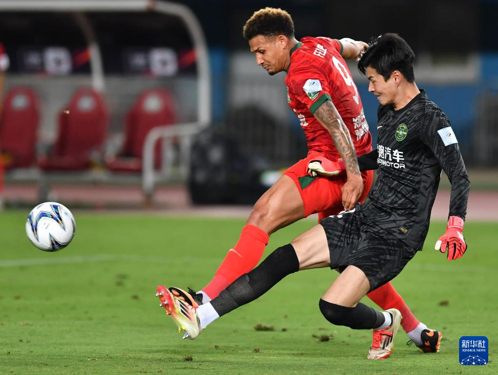 6月22日,河南俱乐部酒祖杜康队球员费利佩·卡多索(左)与浙江俱乐部绿城队门将霍深坪在比赛中拼抢。新华社记者 李嘉南 摄