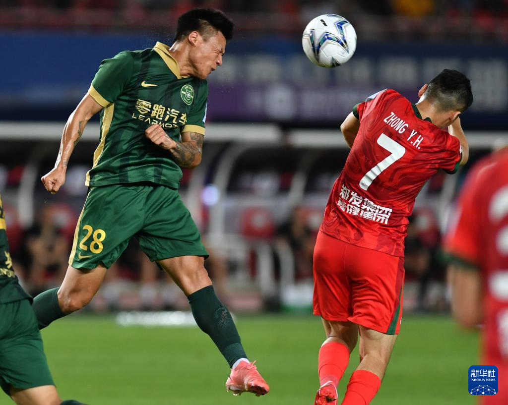 6月22日,浙江俱乐部绿城队球员岳鑫(左)在比赛中争顶头球。新华社记者 李嘉南 摄