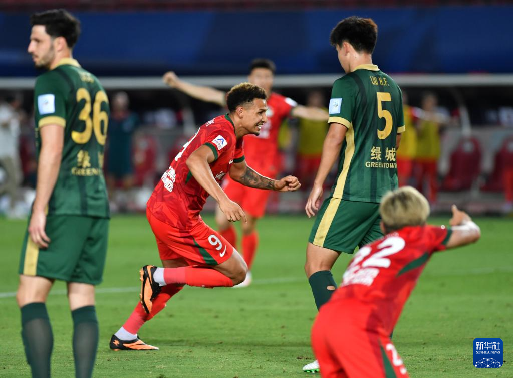 6月22日,河南俱乐部酒祖杜康队球员费利佩·卡多索(中)在比赛中庆祝进球。新华社记者 李嘉南 摄