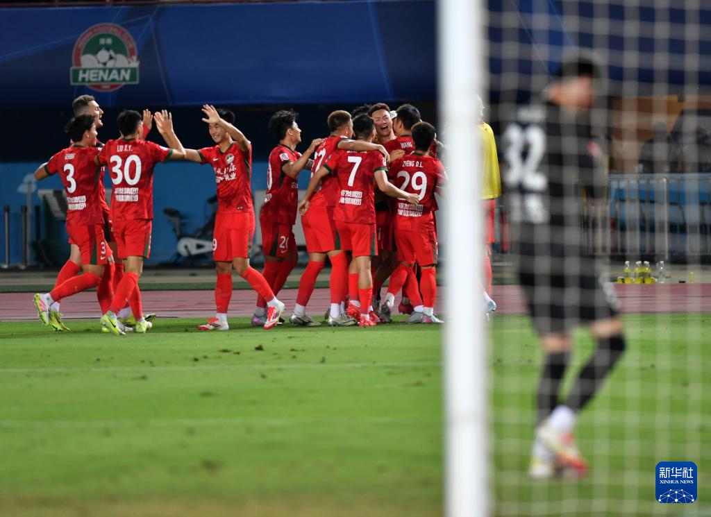 6月22日,河南俱乐部酒祖杜康队球员在比赛中庆祝进球。新华社记者 李嘉南 摄