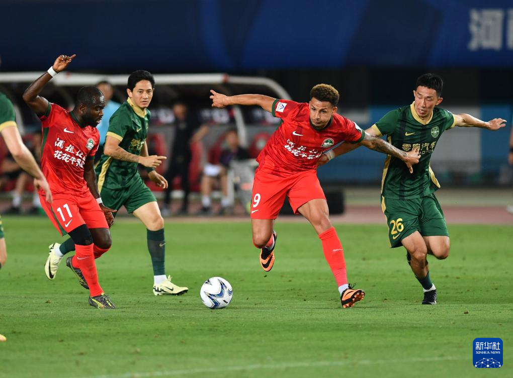6月22日,河南俱乐部酒祖杜康队球员费利佩·卡多索(右二)在比赛中带球突破。新华社记者 李嘉南 摄