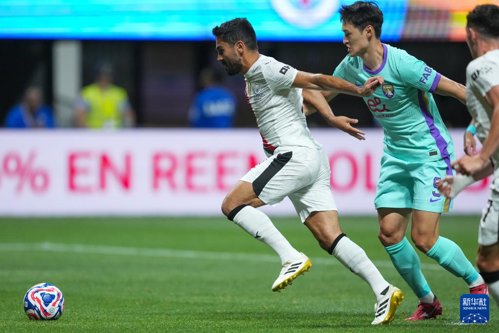 6月22日,曼城队球员格瓦迪奥尔(上左)和艾因队球员朴镕宇(上右)在比赛中争顶。
