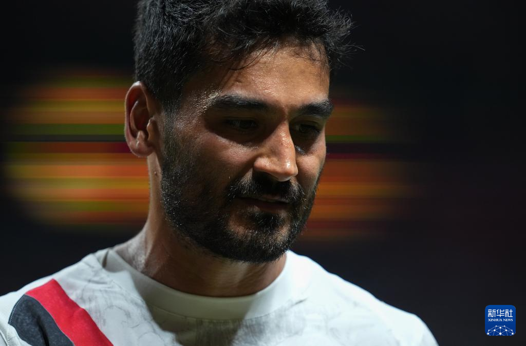 6月22日,曼城队球员京多安(前右)在比赛中射门得分。