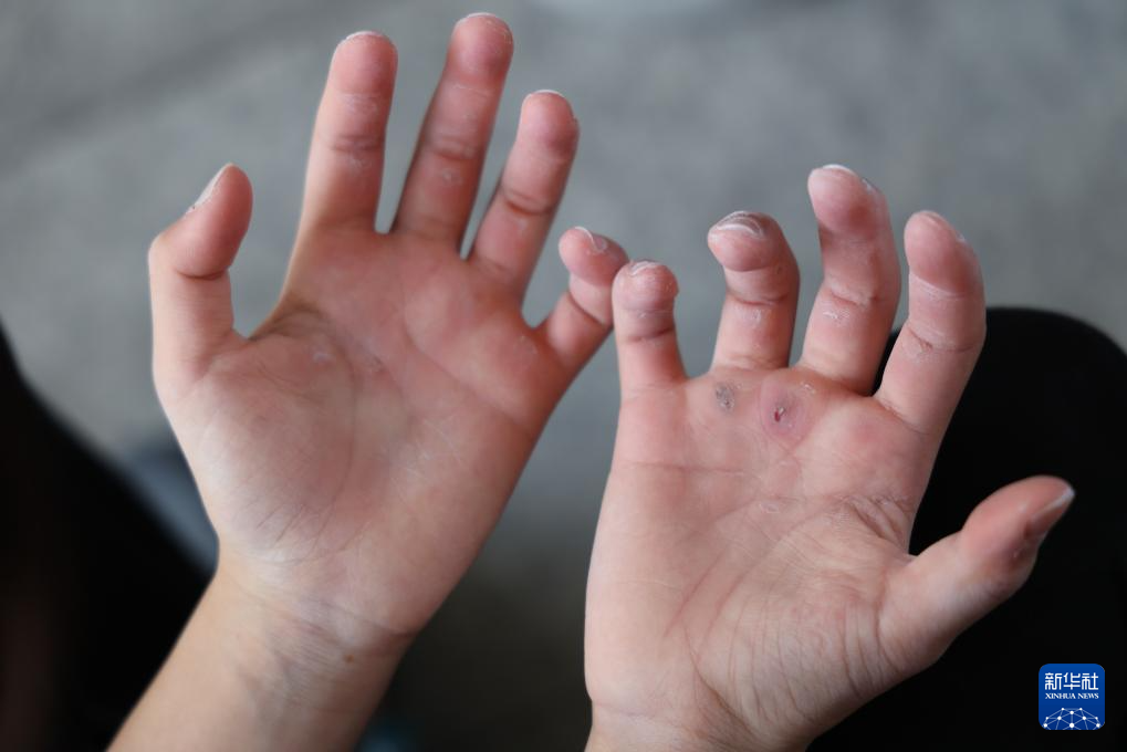 半天的训练结束后,何芊芊的手上磨出了伤口(6月21日摄)。新华社记者 梁旭 摄