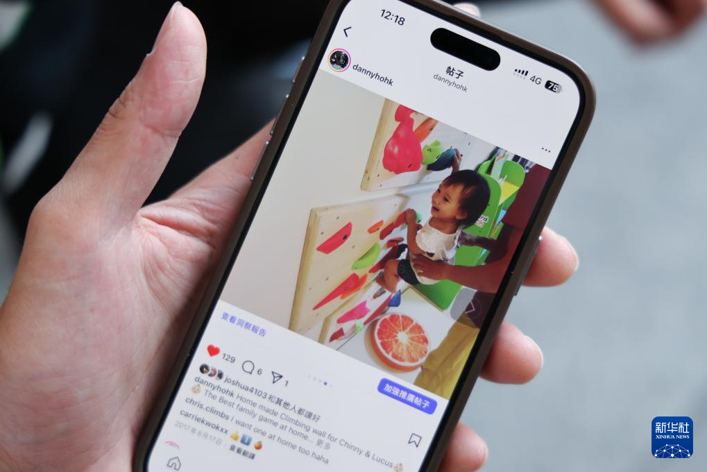 芊芊爸爸何善挥展示2017年在社交媒体上发布的照片,在照片里,他正带着芊芊在家里的小攀岩墙上玩耍(6月21日摄)。新华社记者 梁旭 摄