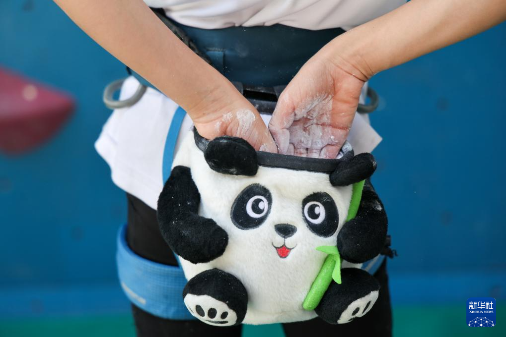 在开始攀爬一条难度线路前,何芊芊从她最爱的熊猫粉袋里抓一把镁粉,防止手打滑(6月21日摄)。新华社记者 梁旭 摄
