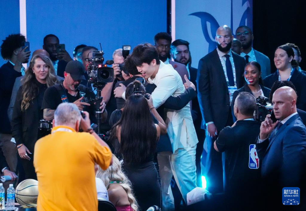 6月25日,杨瀚森在新秀选拔大会现场与朋友拥抱。新华社发(孙宇轩摄)