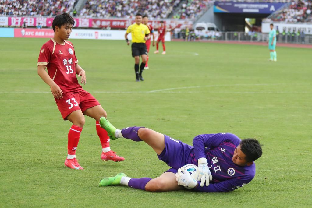 6月15日,镇江队客场0:1不敌徐州队,门将沈帅帅(下)在比赛中扑救。新华社发(白雪摄)