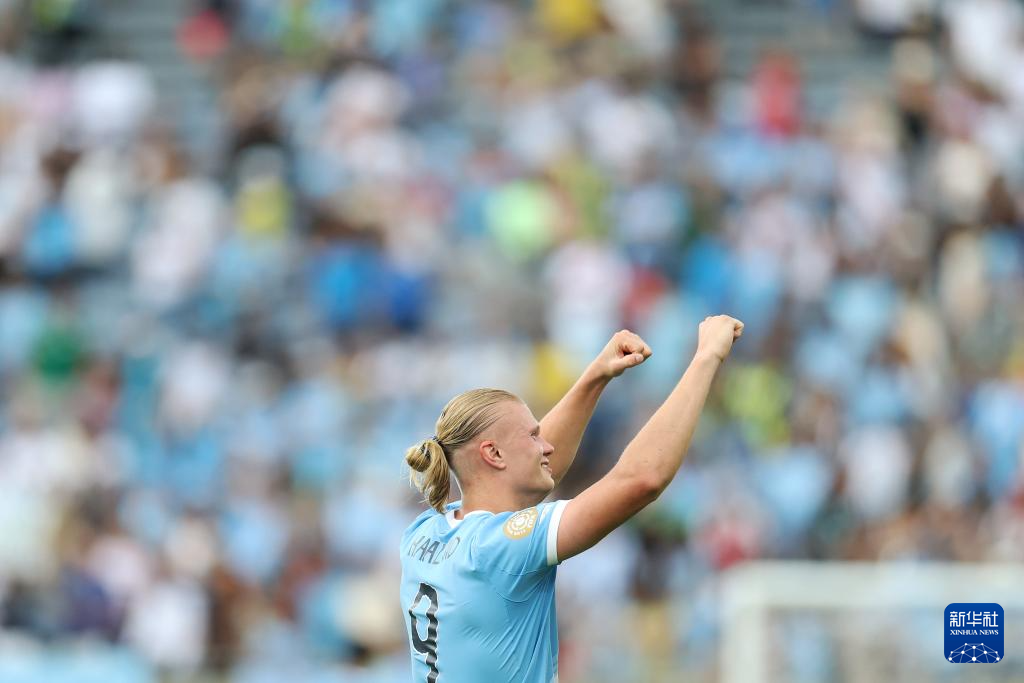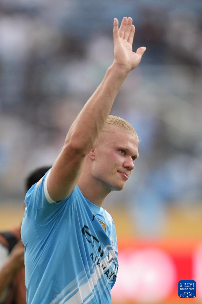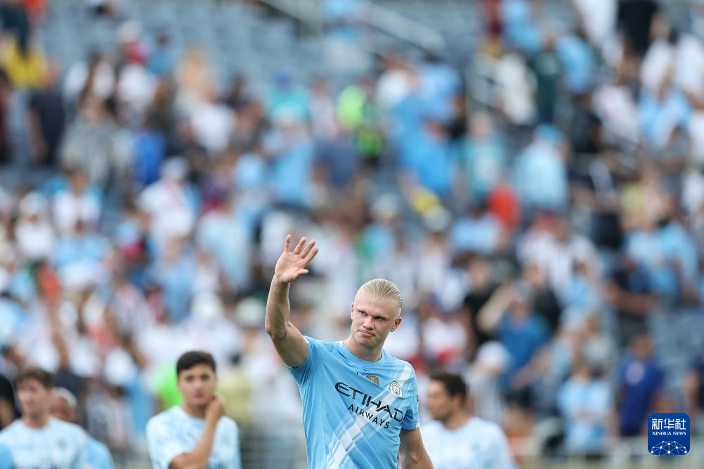 6月26日,曼城队球员哈兰德在赛后向观众致意。