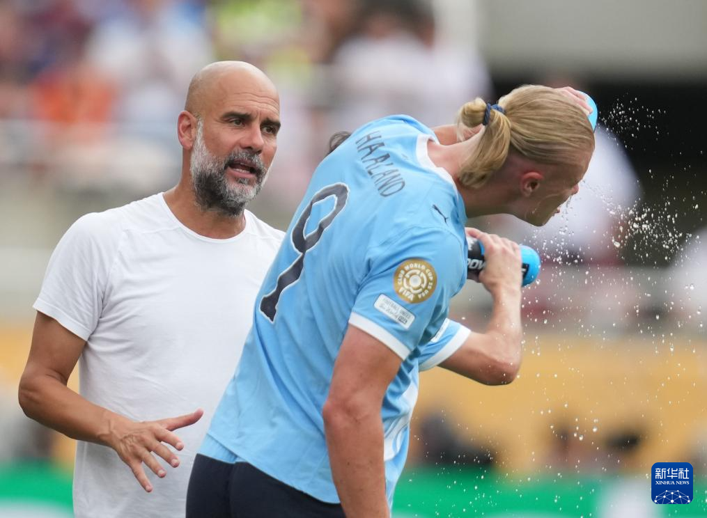 6月26日,曼城队主教练瓜迪奥拉(左)在比赛暂停时与球员哈兰德沟通。