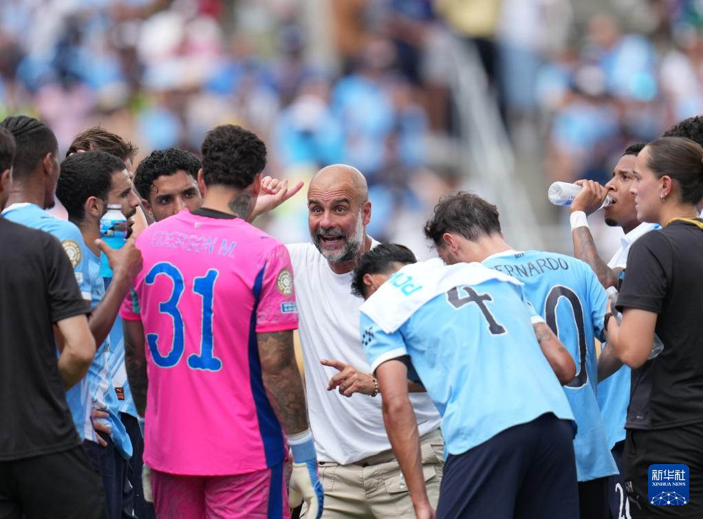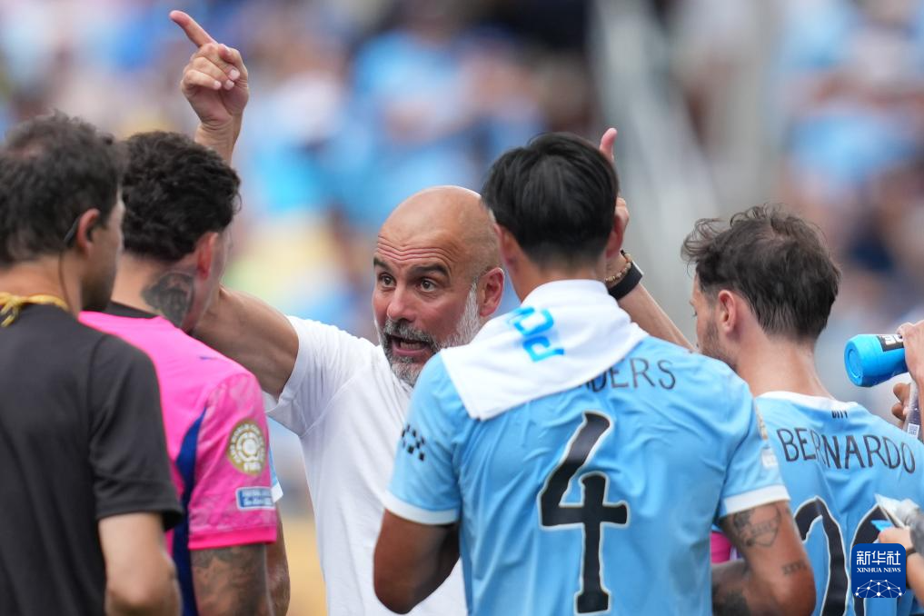 6月26日,曼城队主教练瓜迪奥拉在比赛暂停时部署战术。